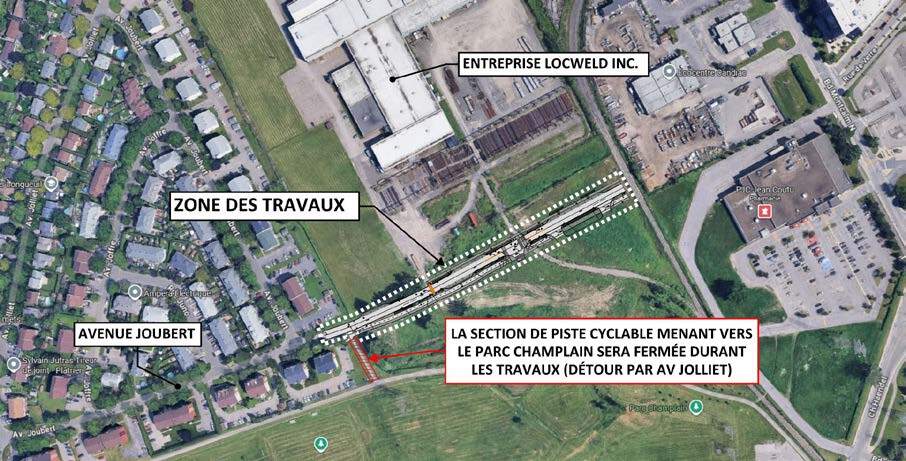 L’accès à la piste cyclable menant au parc Champlain, située à l’extrémité de l’avenue Joubert, sera temporairement fermée pendant la durée des travaux. Une déviation de la piste existante a été mise en place depuis la fin d’août avec un nouveau tracé par l’avenue d’Hochelaga.